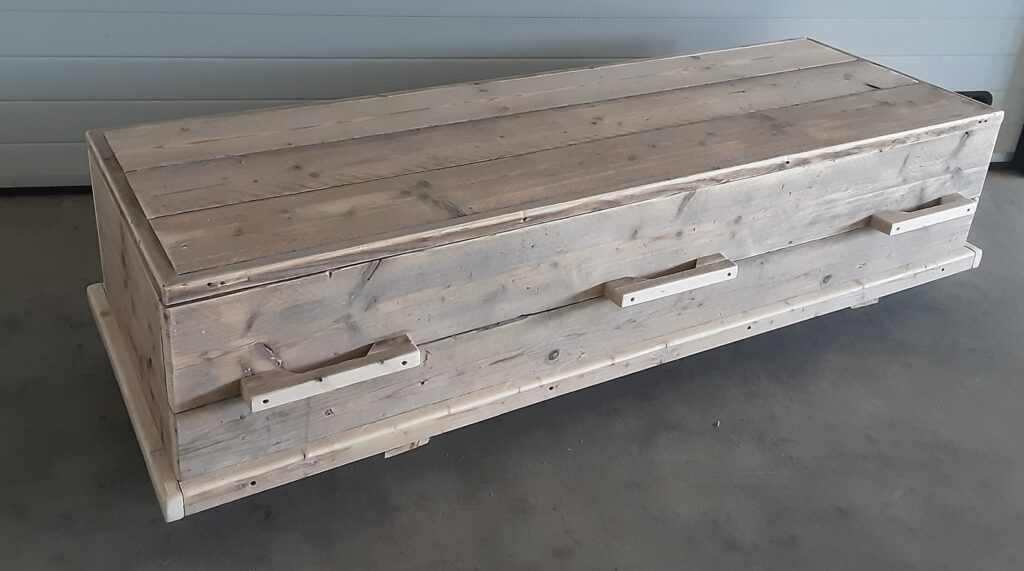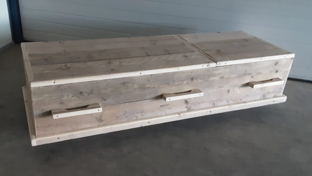 Wij ontwerpen en vervaardigen nu ook uitvaartkisten van oud steigerhout. Wij streven er naar de uitvaartkisten zo milieuvriendelijk uit te voeren als mogelijk is. De kisten zijn dus geschikt voor begraven en cremeren. Een massiefhouten uitvaartkist van oud steigerhout wordt standaard mooi opgeschuurd, zodat het bijzondere karakter van het oude gebruikte hout nog beter naar voren komt. De kisten kunnen onbehandeld geleverd worden of afgewerkt met een watergedragen lak.